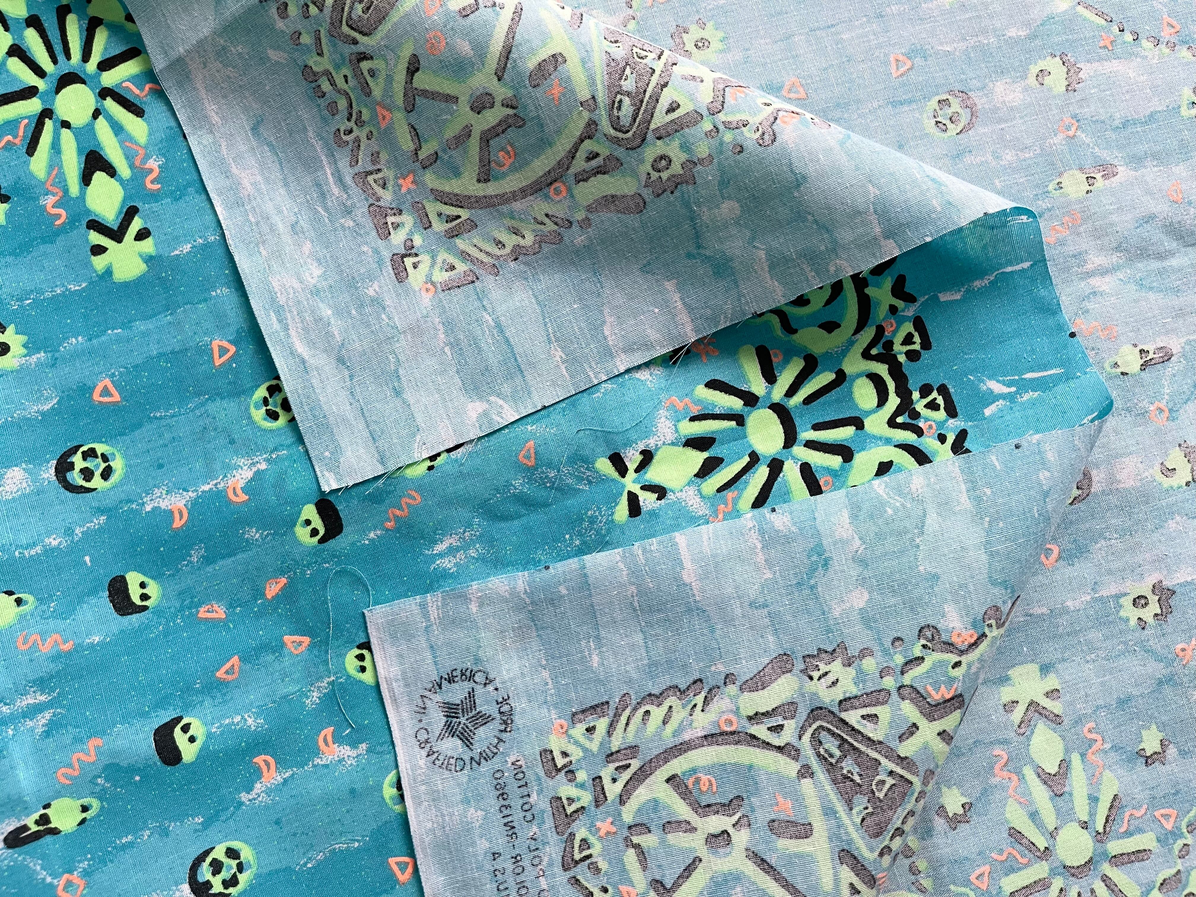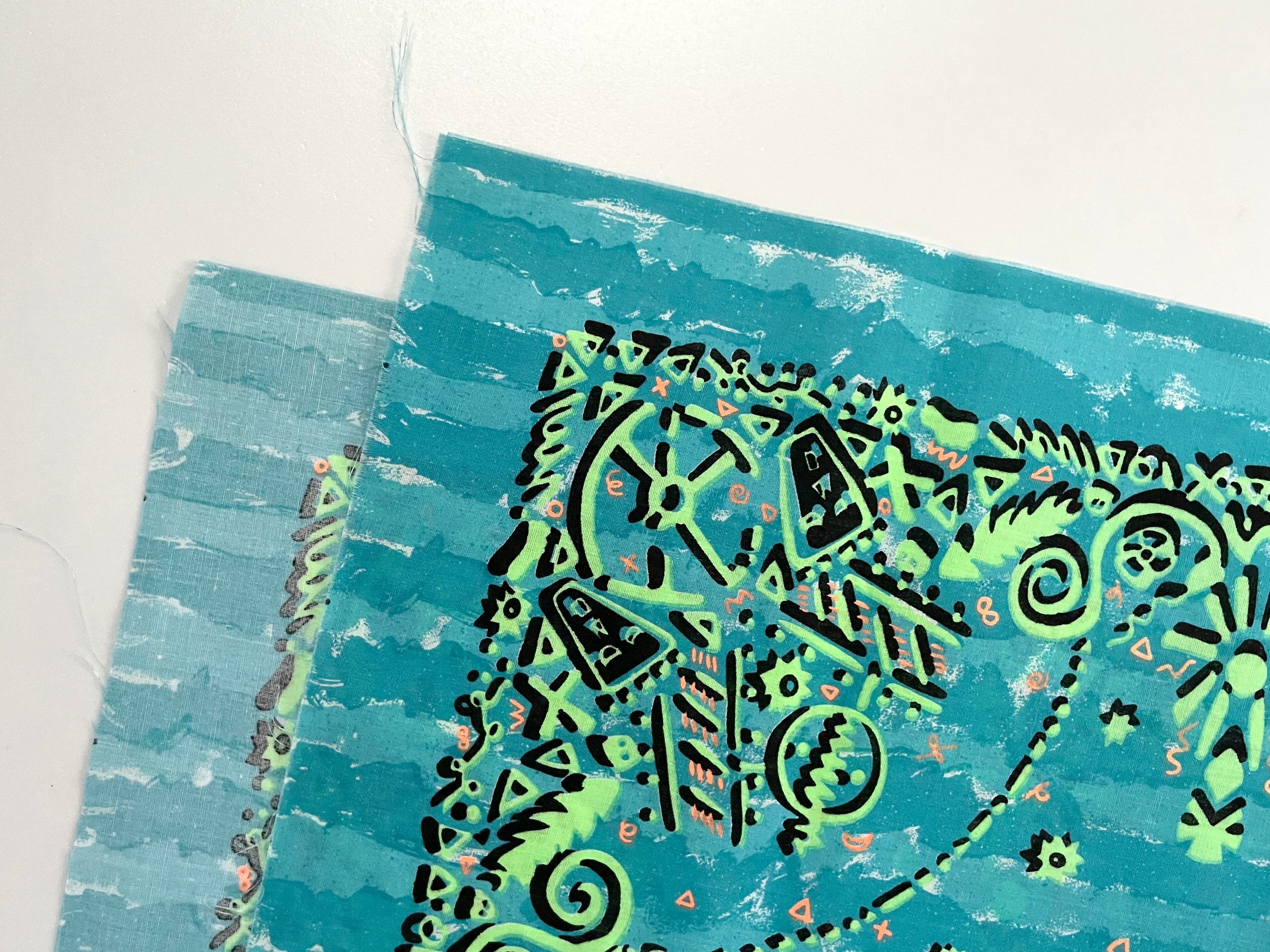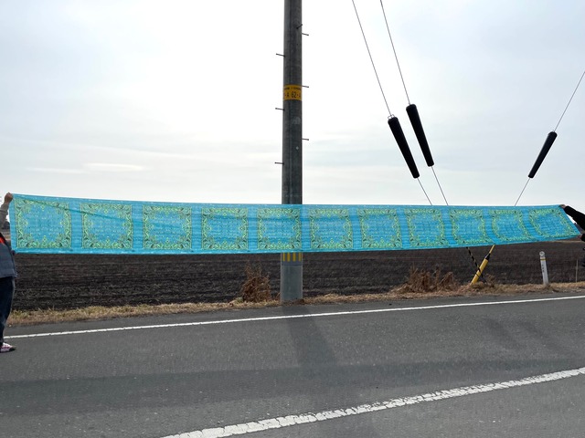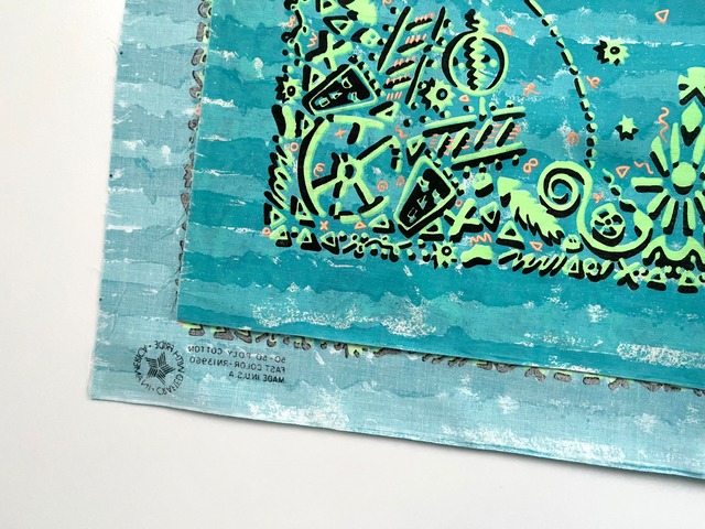 バンダナはバンダナ2列にデザインされ、その生地を裁断・縫製をしてようやく一枚のバンダナが出来上がります。