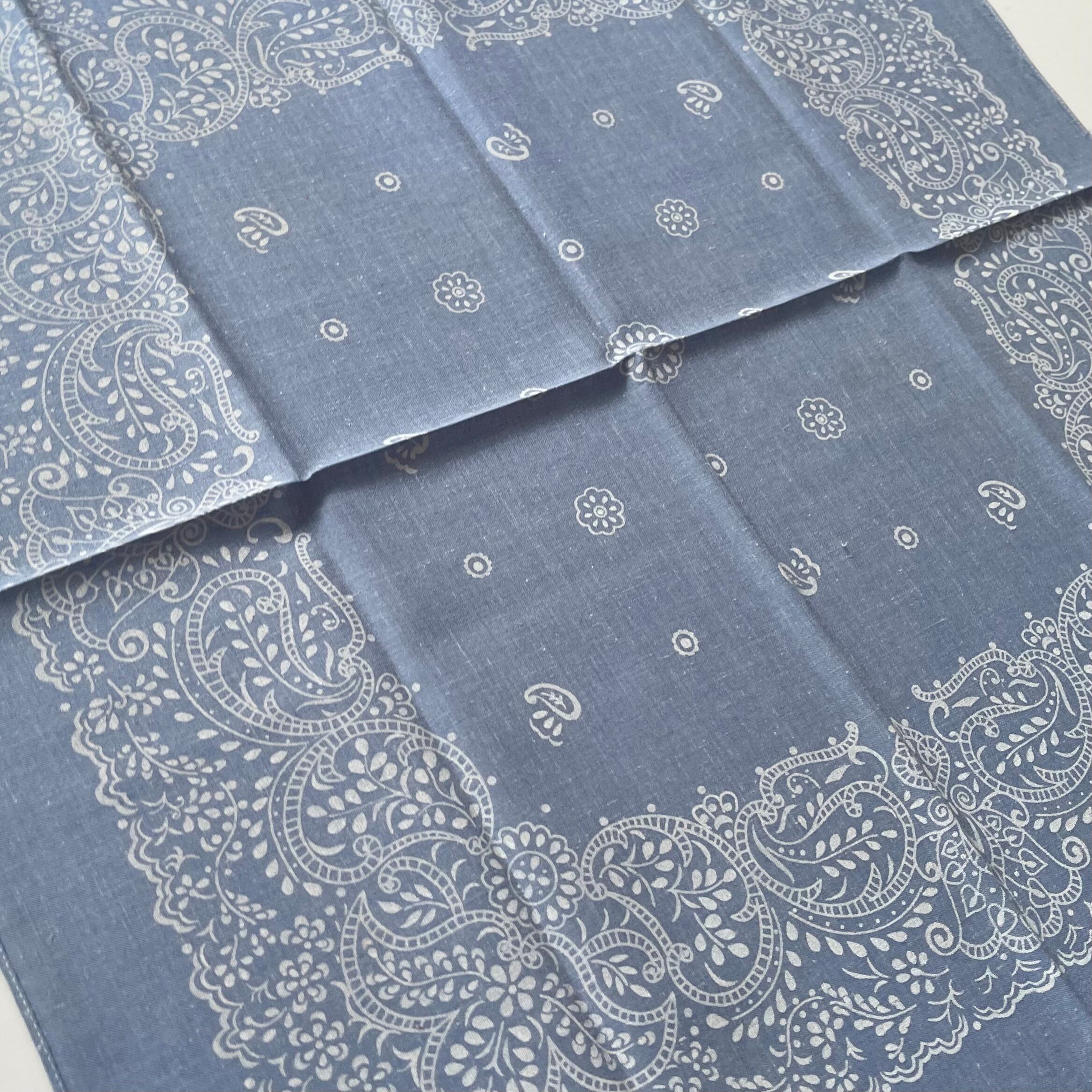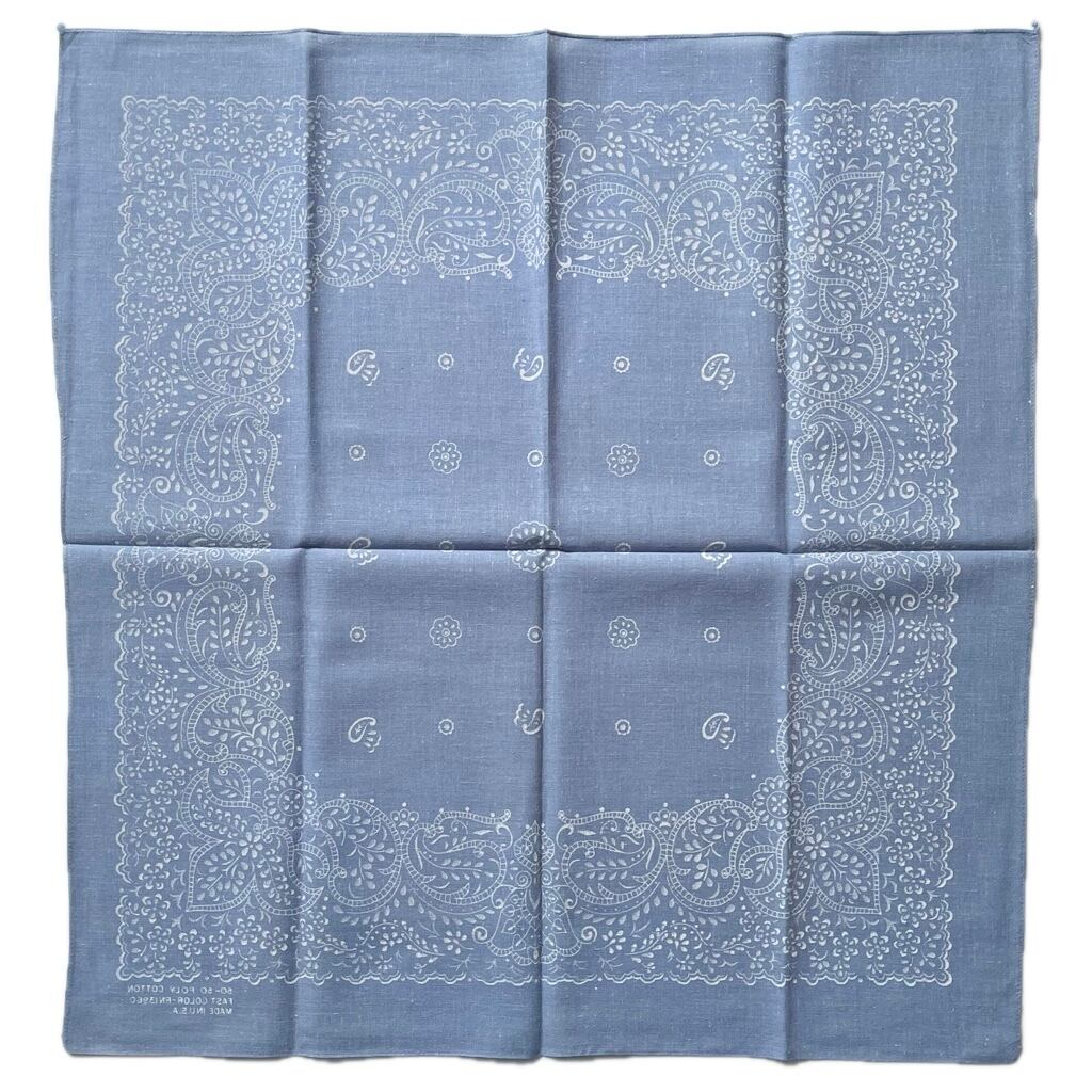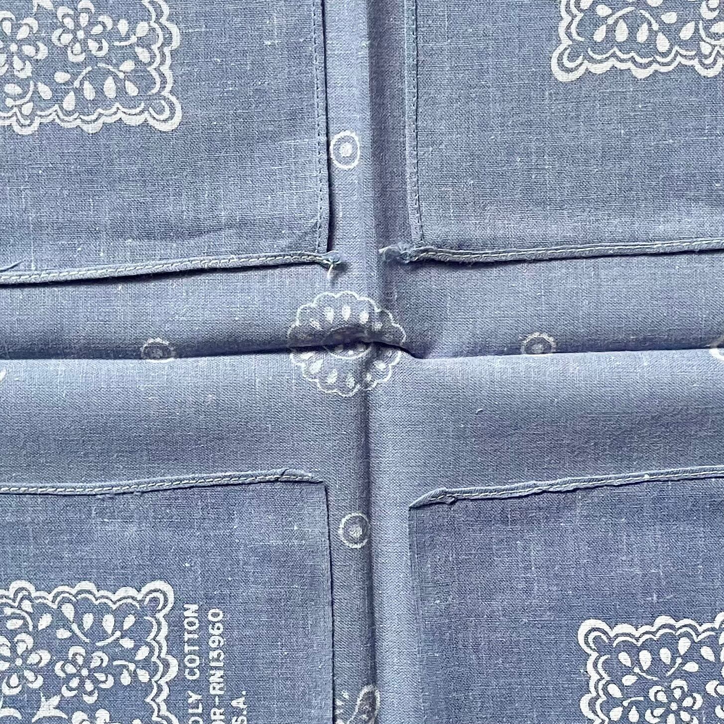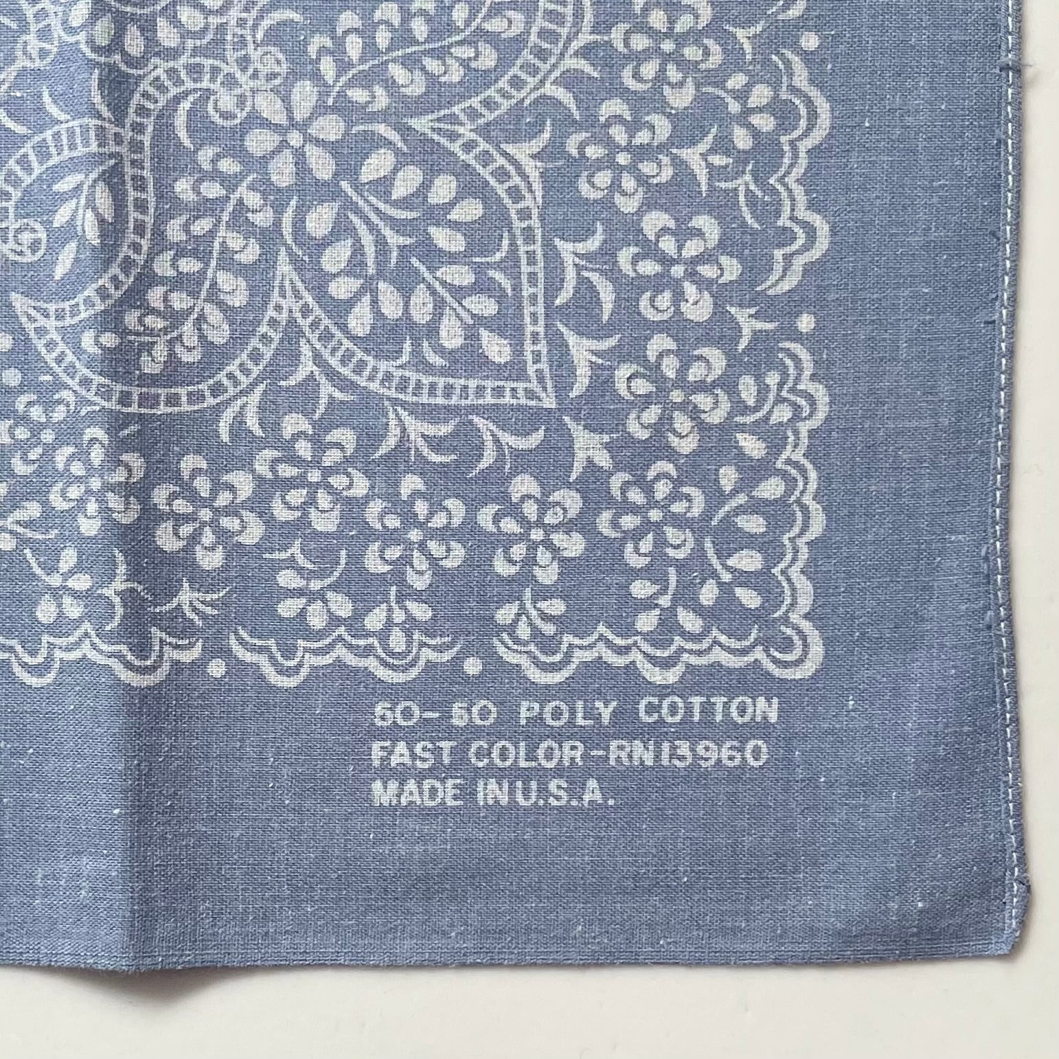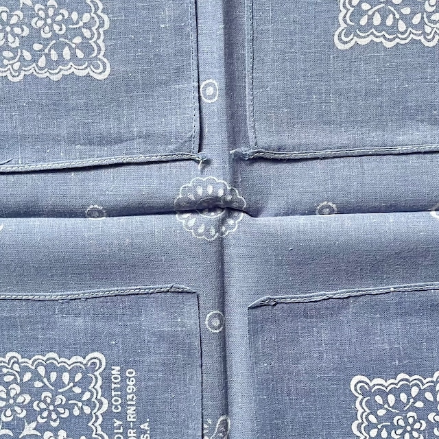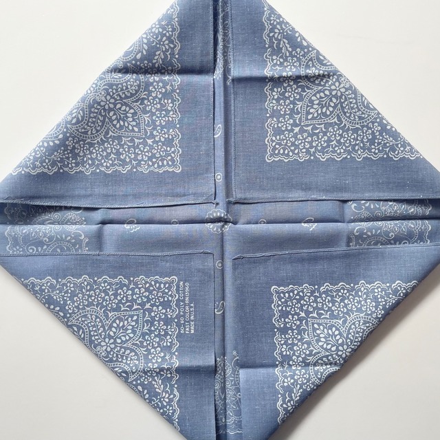 生地1辺ミミ付き、2辺シングルステッチ、1辺チェーンステッチ。