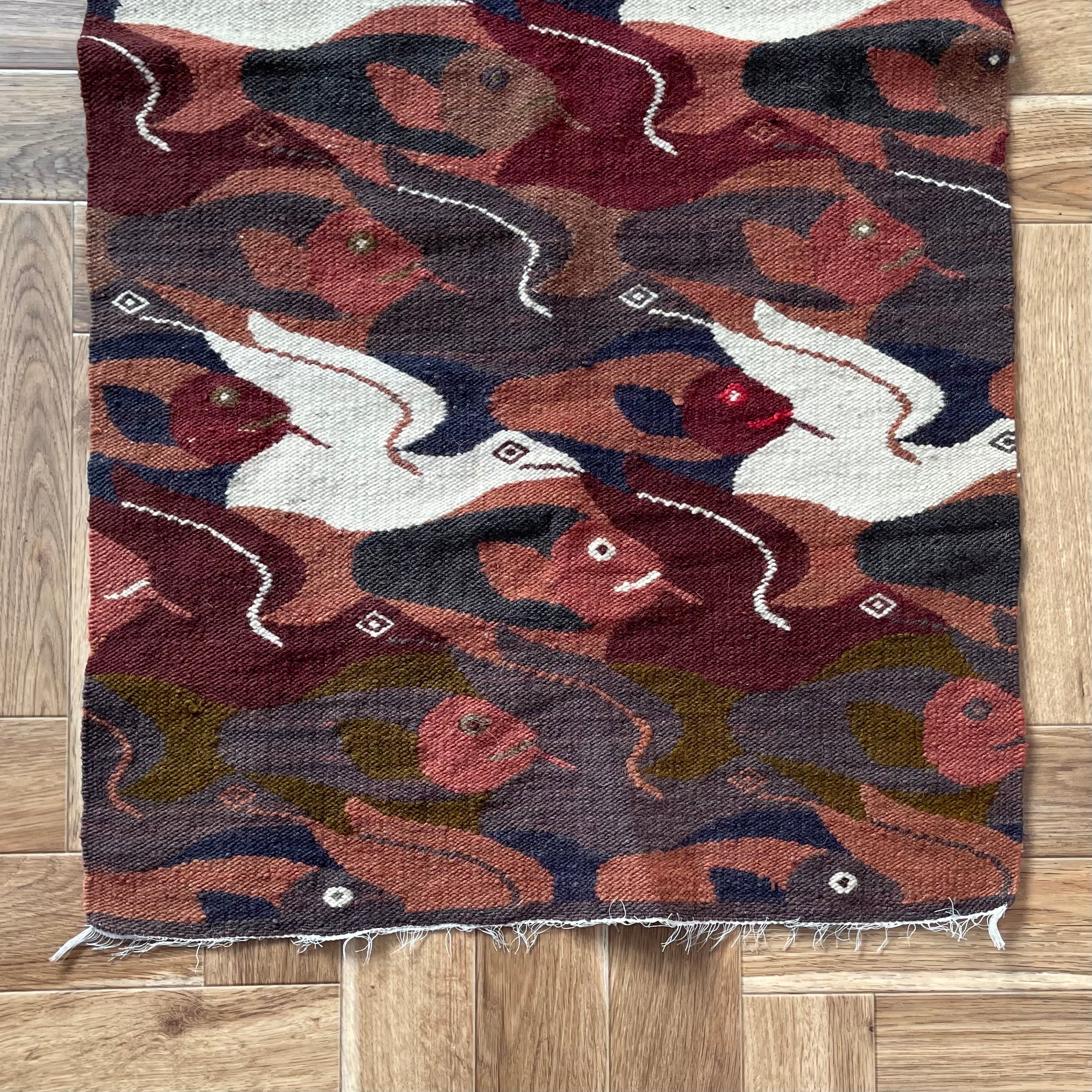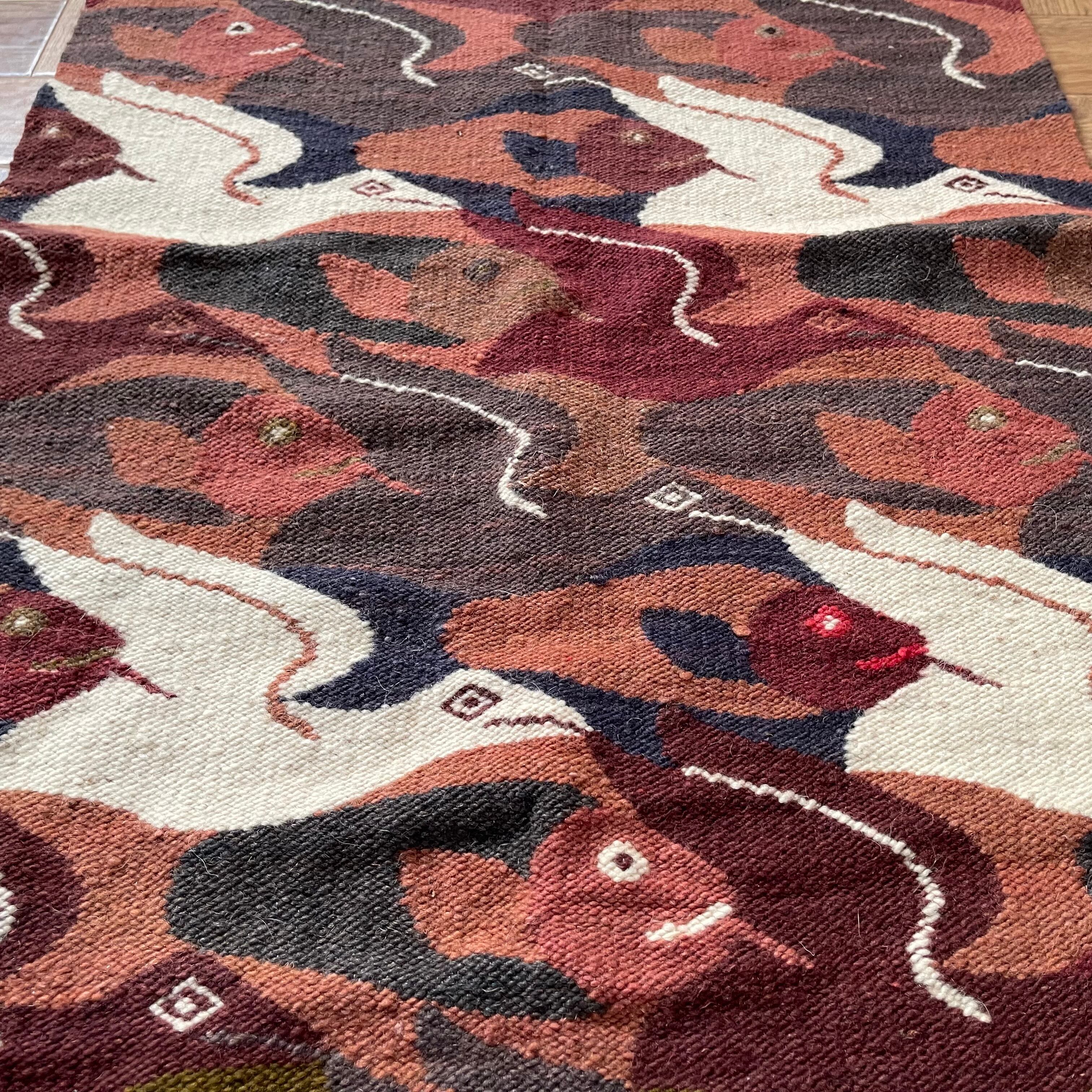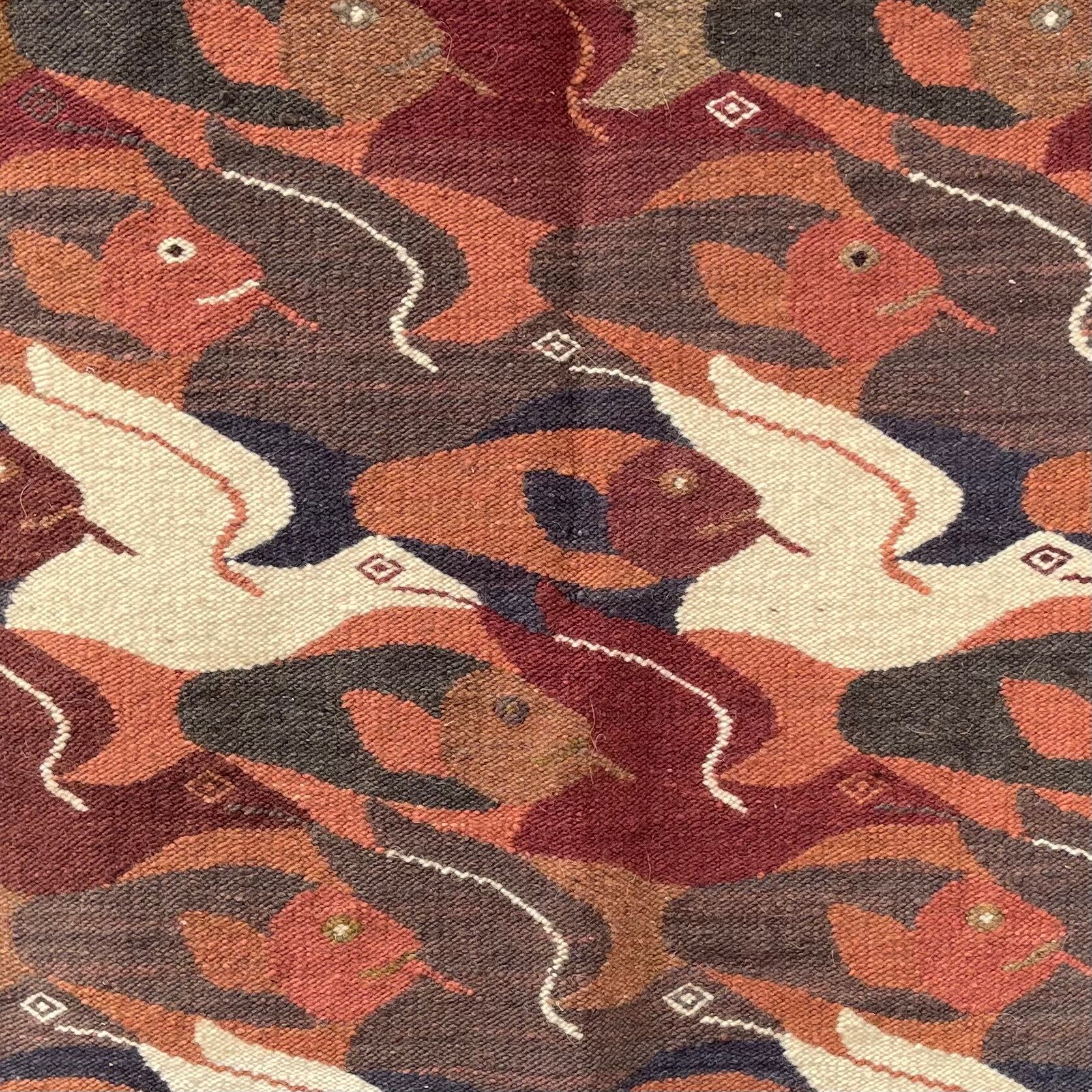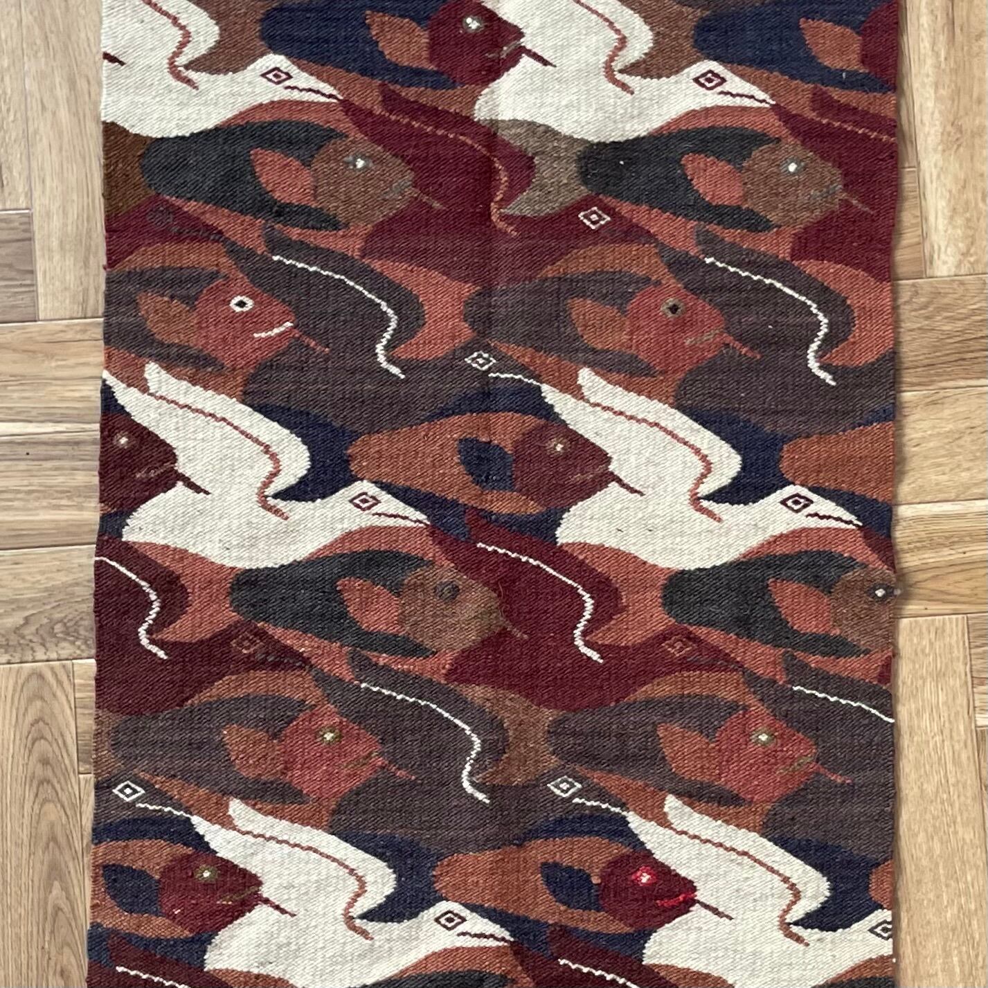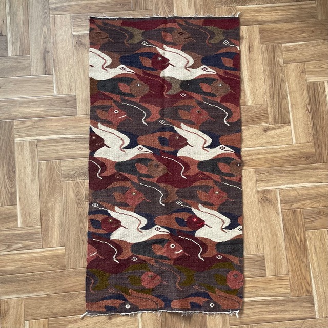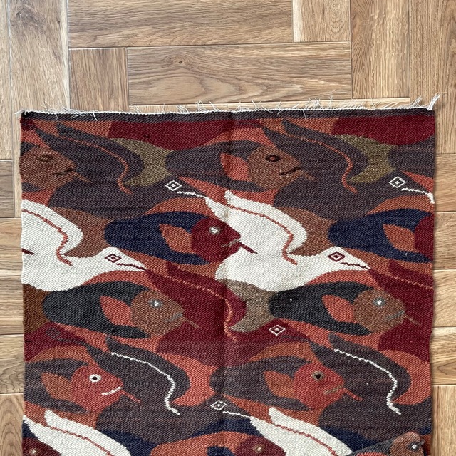 魚と鳥が規則的にデザインされたラグ。