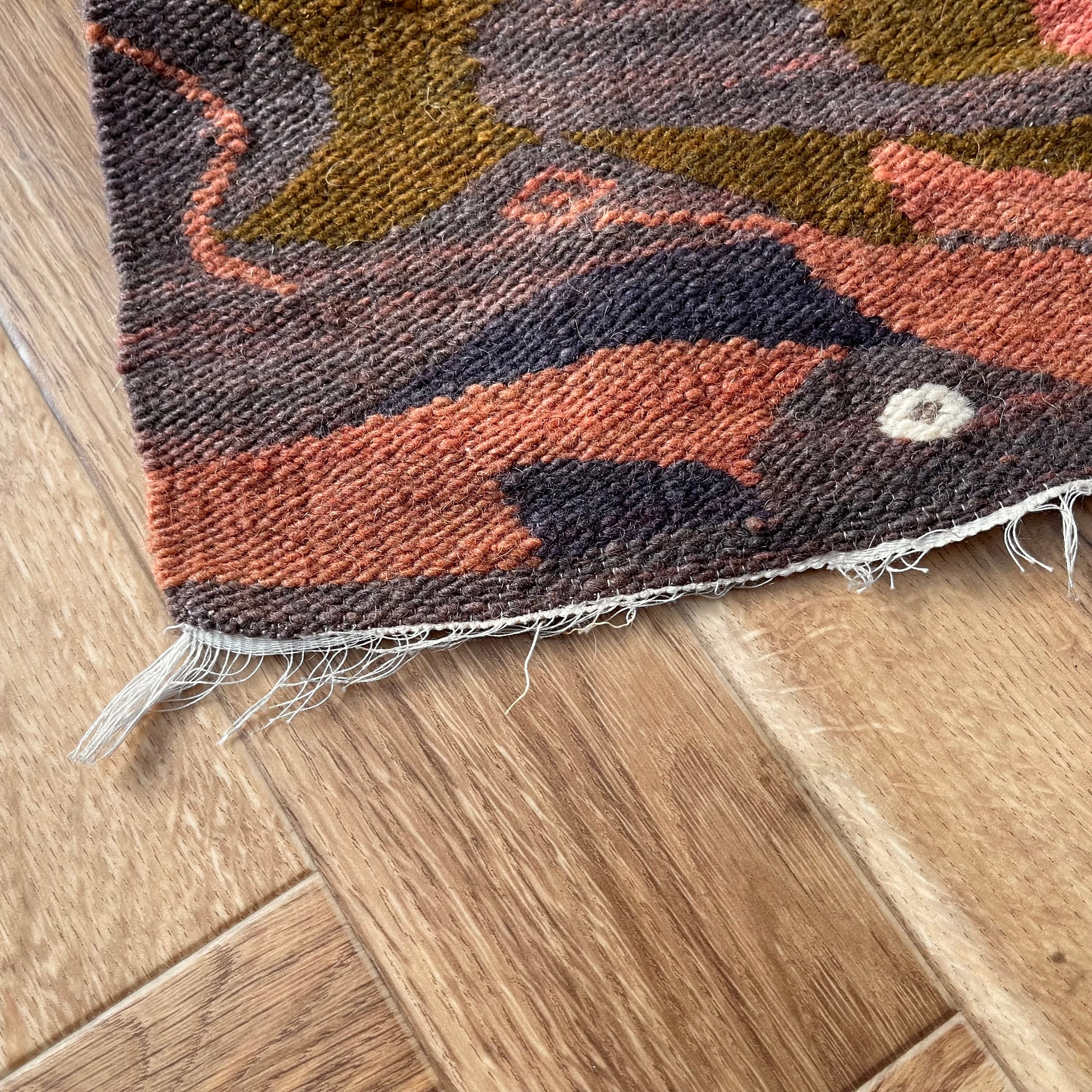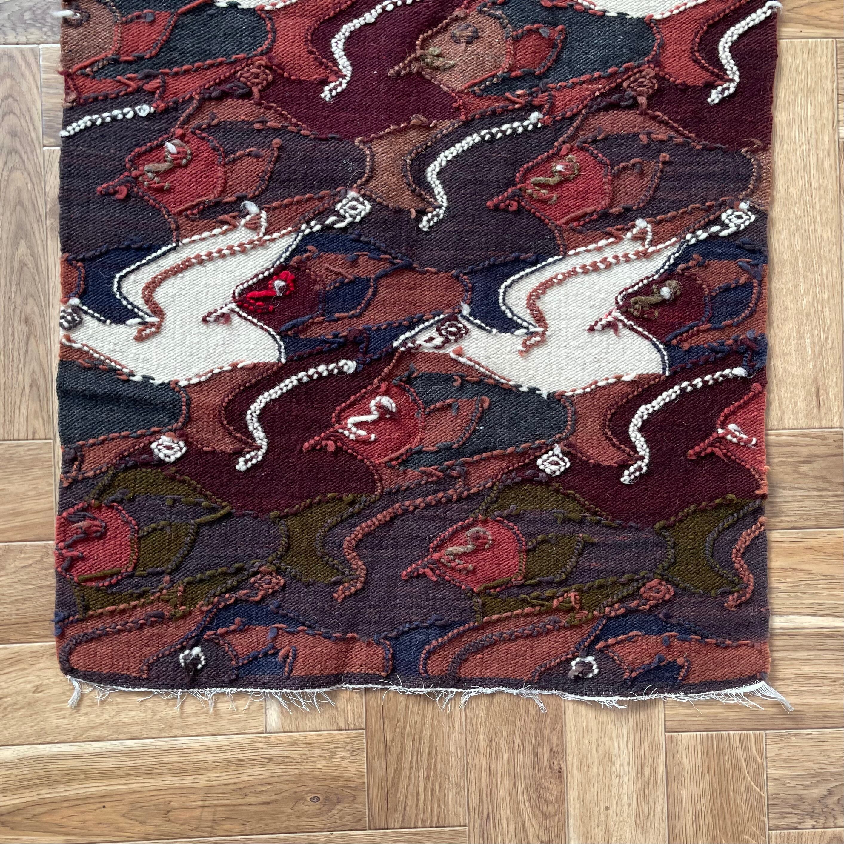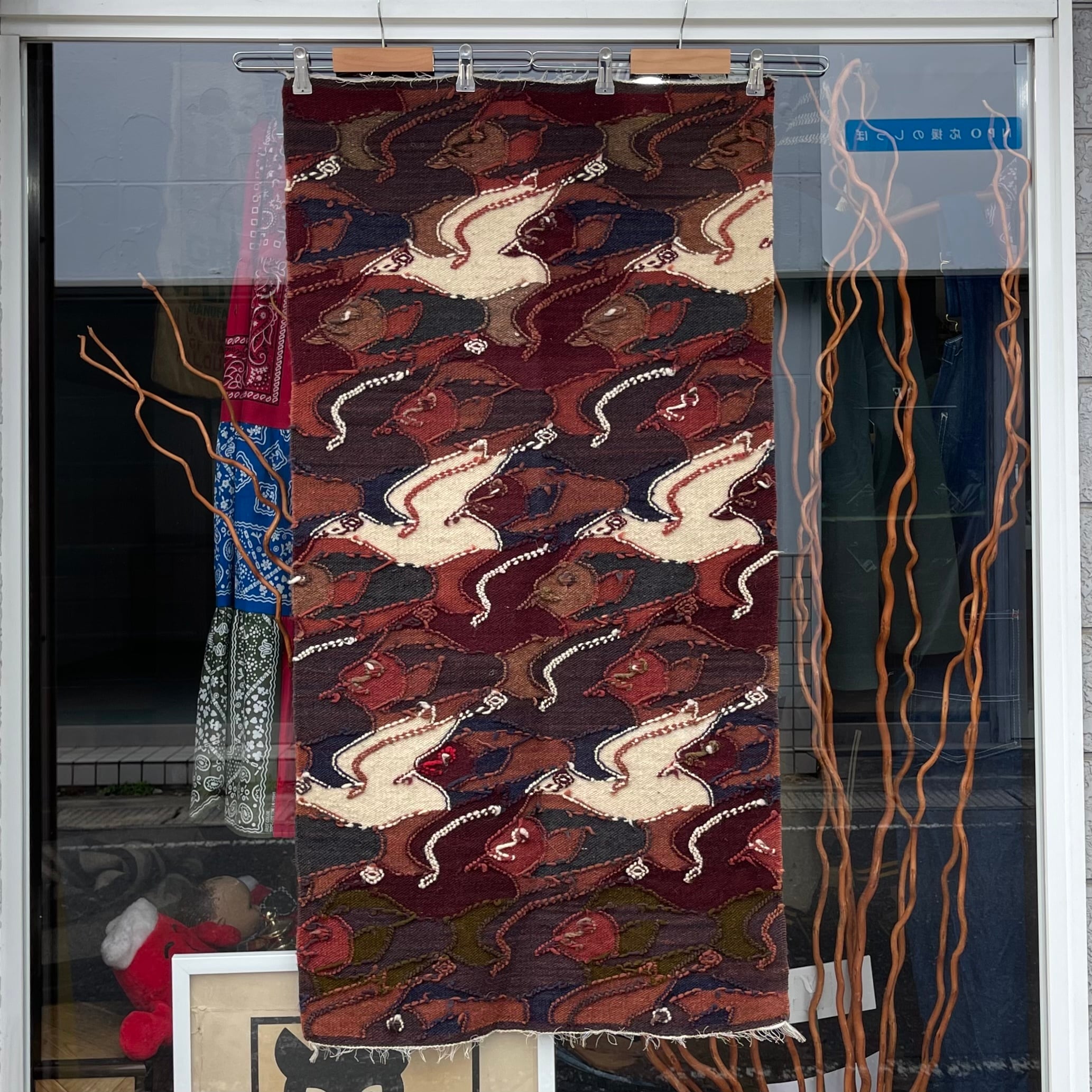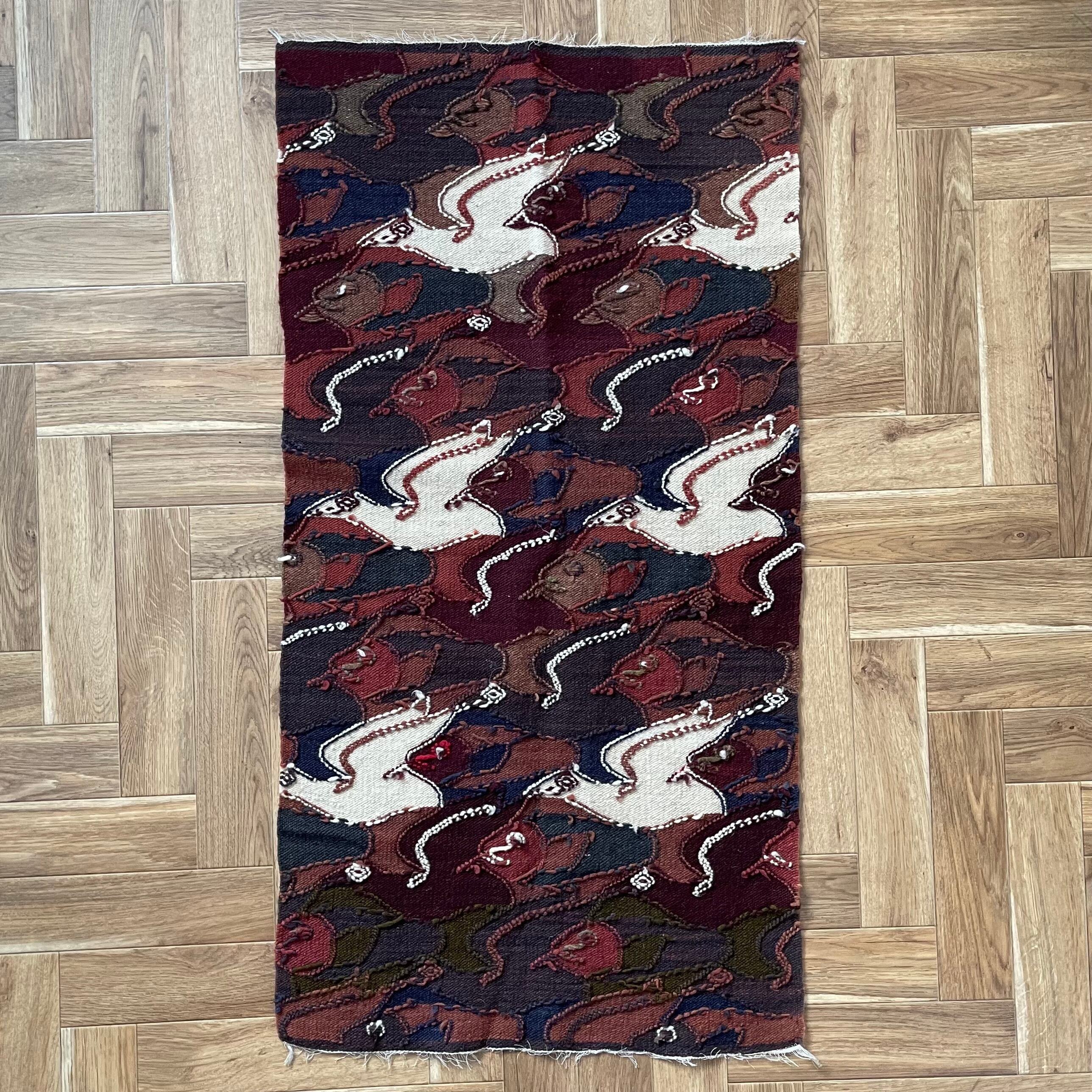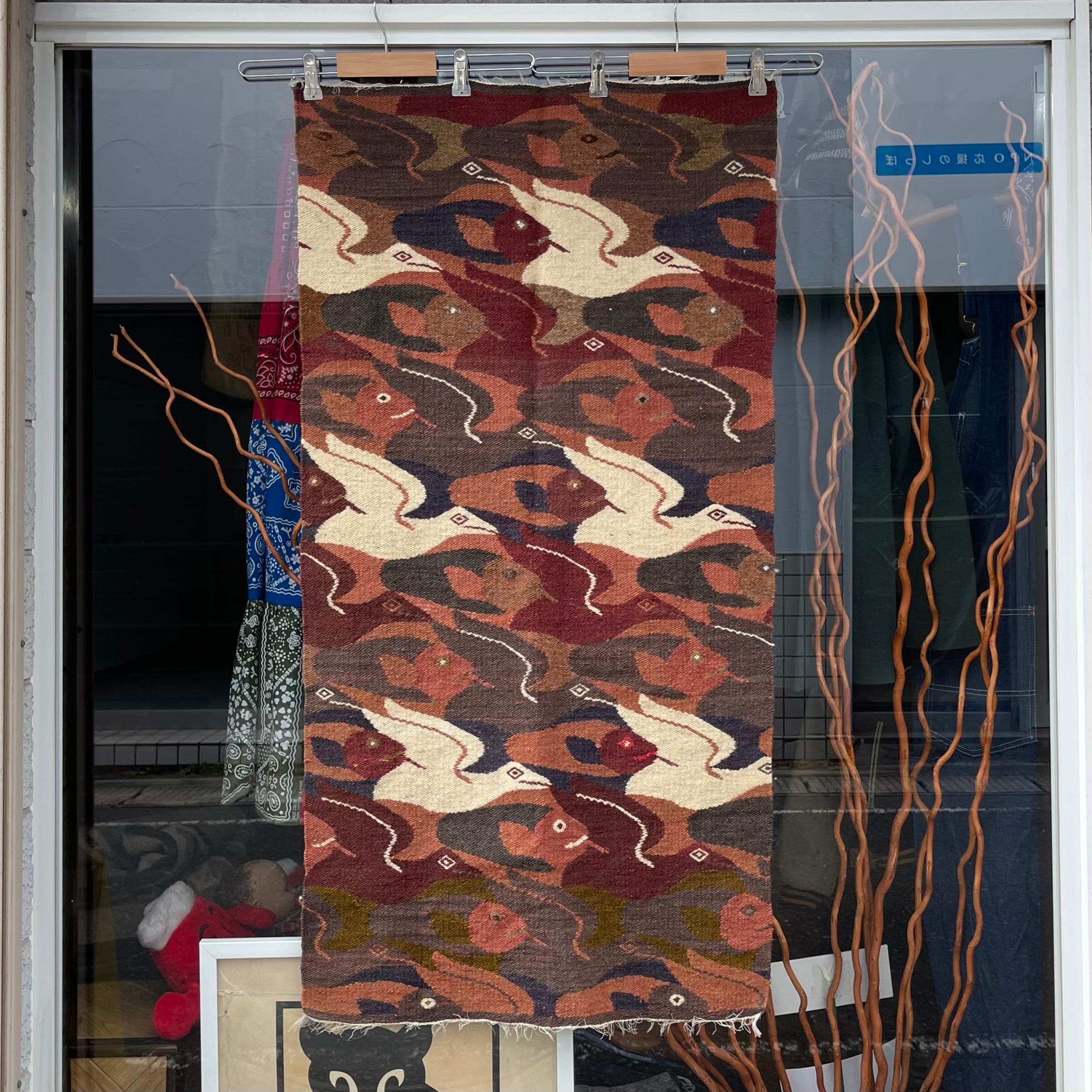 魚と鳥が規則的にデザインされたラグ。