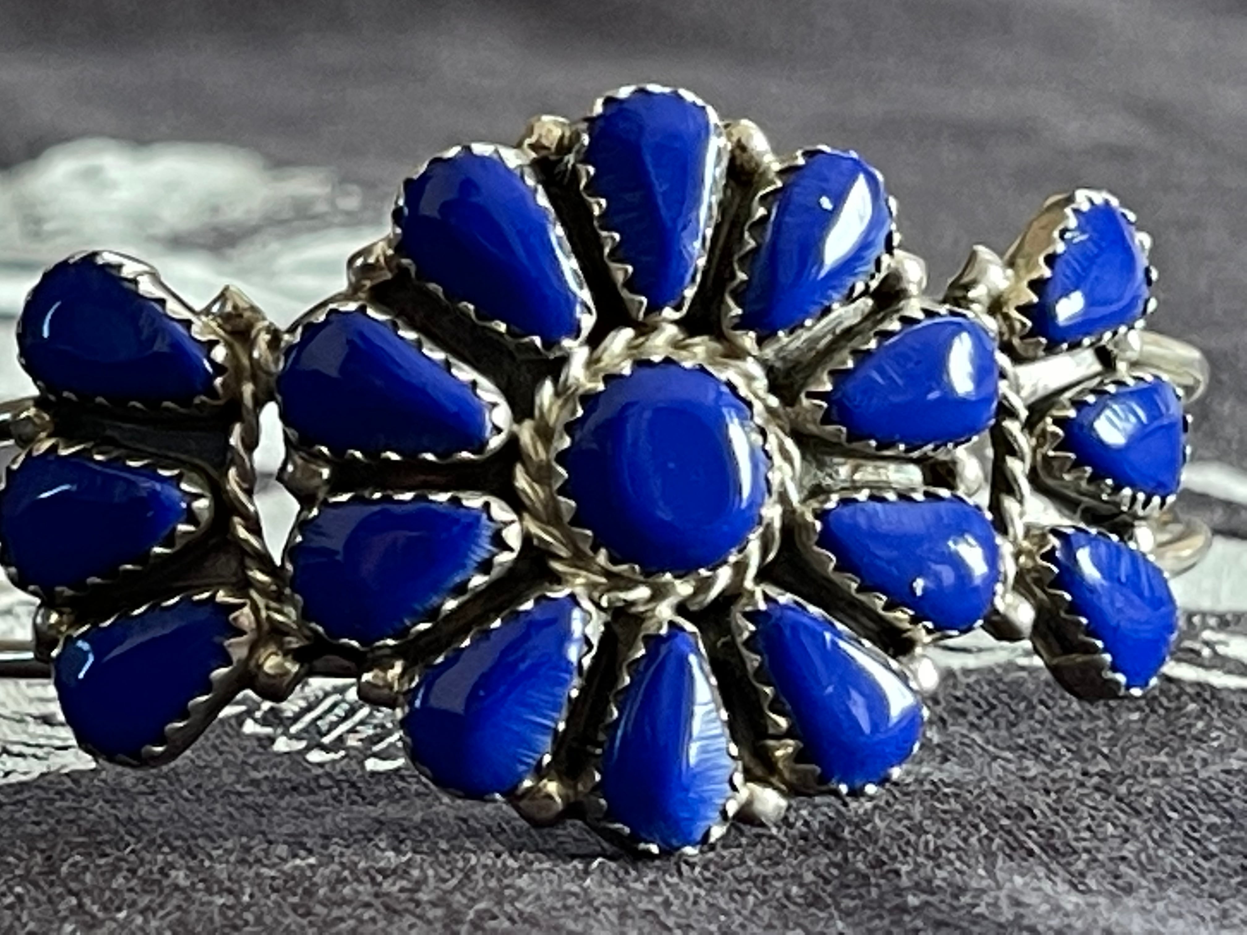 シルバーの枠の中に、青い石・ラピスラズリを花のように並べたクラスター技法で作られています。