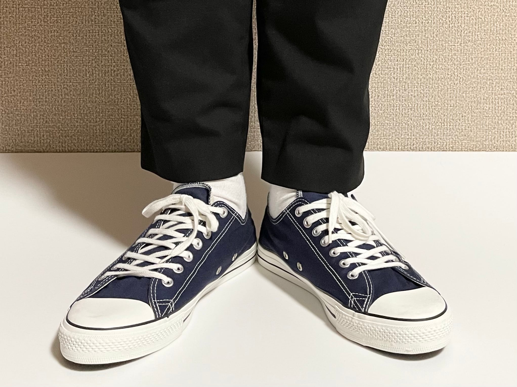 コンバースオールスターに似ている形ですが、トゥ部分はやや丸みを帯びた形。